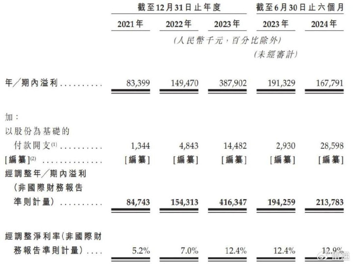 沪上大姨2021年、2022年、2023年经调理净利永诀为8474万元、1.54亿元、4.16亿元;沪上大姨2024年上半年经调理净利为2.14亿元,上年同时的经调理净利为1.94亿元。