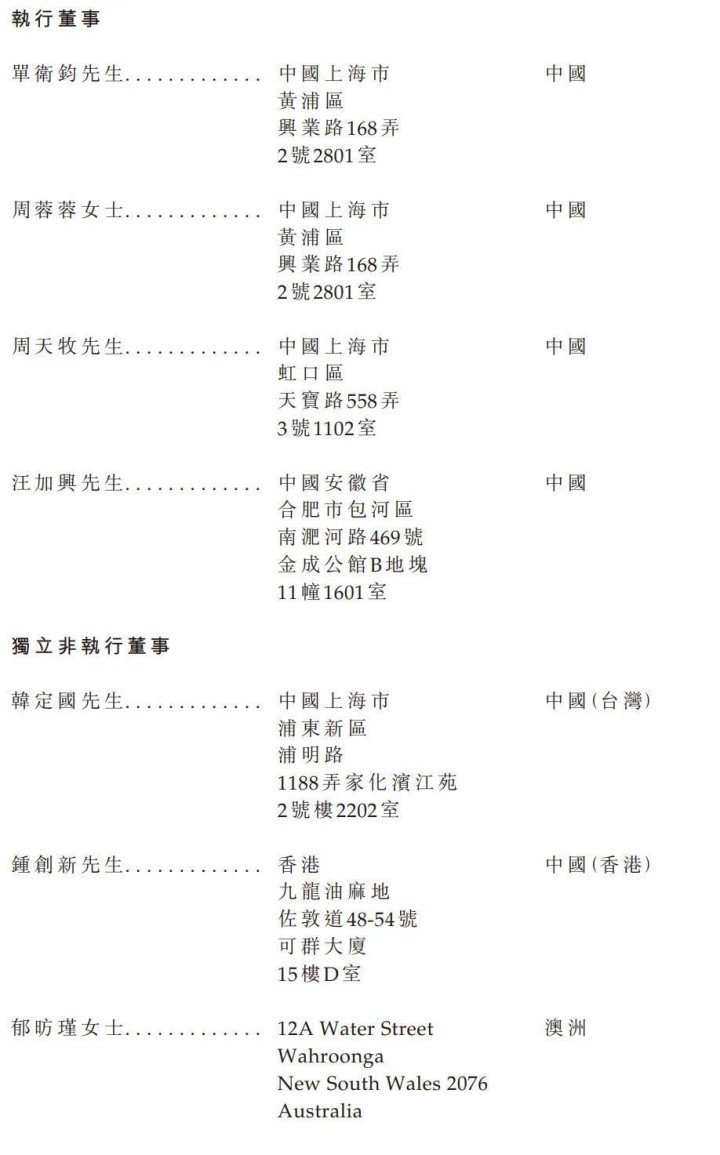 单卫钧、周蓉蓉女士为鸳侣磋磨。其中,单卫钧为公司集中创举东说念主、董事会主席、实践董事兼行政总裁。周蓉蓉女士为公司集中创举东说念主、实践董事兼副行政总裁。