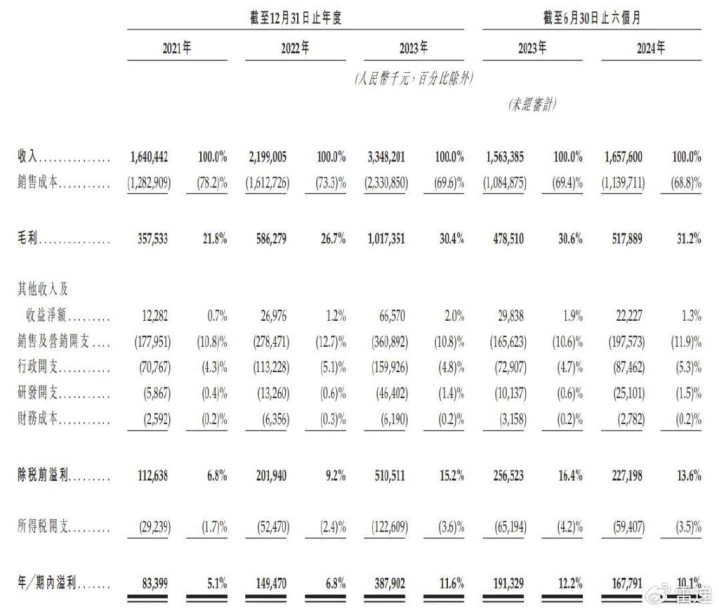 沪上大姨2021年、2022年、2023年毛利率永诀为21.8%、26.7%、30.4%;期内利润永诀为8340万元、1.49亿元、3.88亿元。