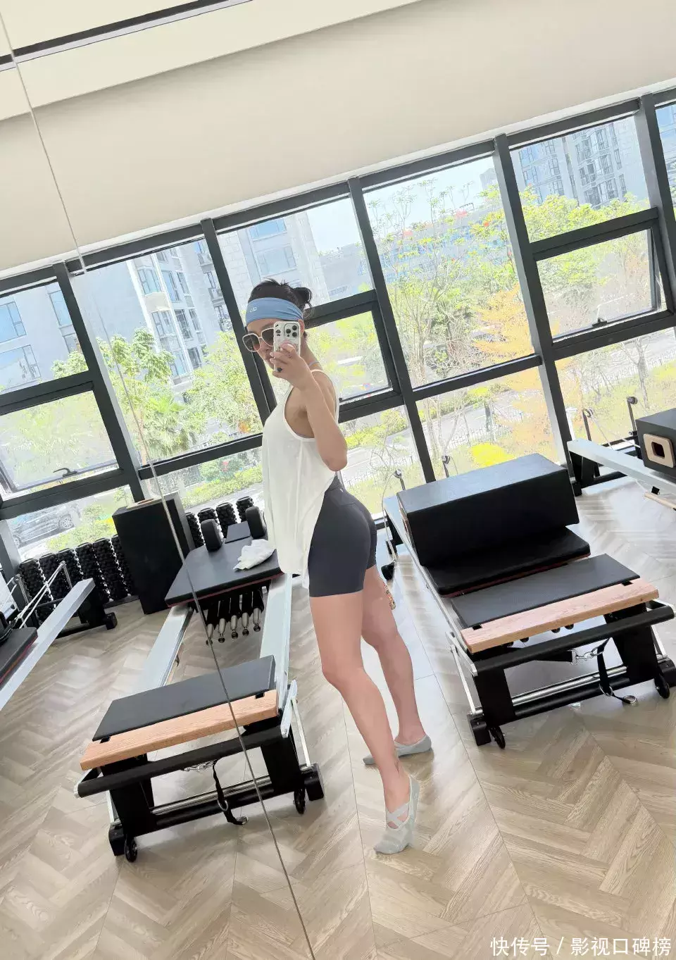 杨采钰的健身相片是一稔宽松的白色上衣下搭紧身短裤,戴着墨镜,她将头发盘起。