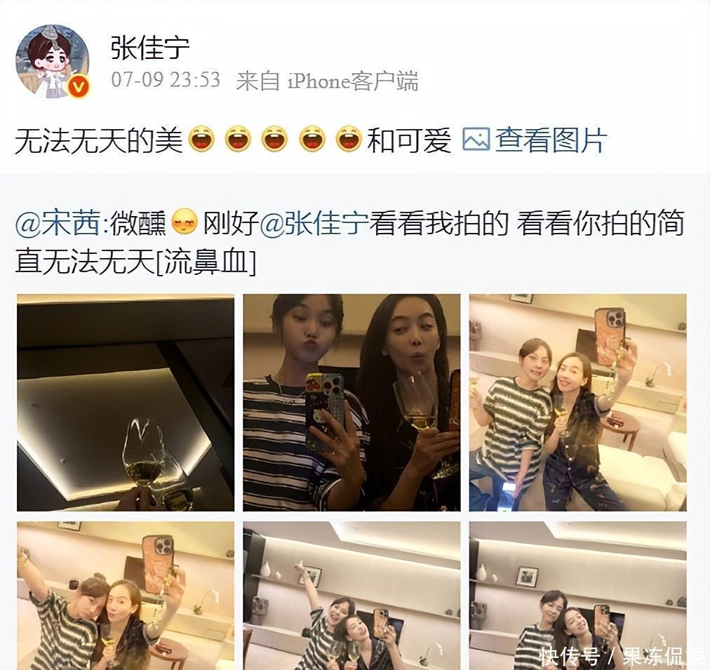7月9号两东谈主夜深在家喝酒聊天,穿寝衣拍相片,看起来很收缩。第一次约聚是和唐艺昕一齐,第三次是张佳宁诞辰,此次又是宋茜家里见。俩东谈主频繁一齐吃饭拍照,粉丝皆说她们厚谊比姐妹还铁。