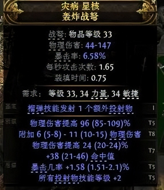 刀兵参考:33级后,更换刀兵,轰炸战弩的基础底细有+1极度榴弹,如故优先高伤害即可。物理、元素,后缀投射物等第均可,多关心商店和拾取,这把刀兵足已通关前四章节。