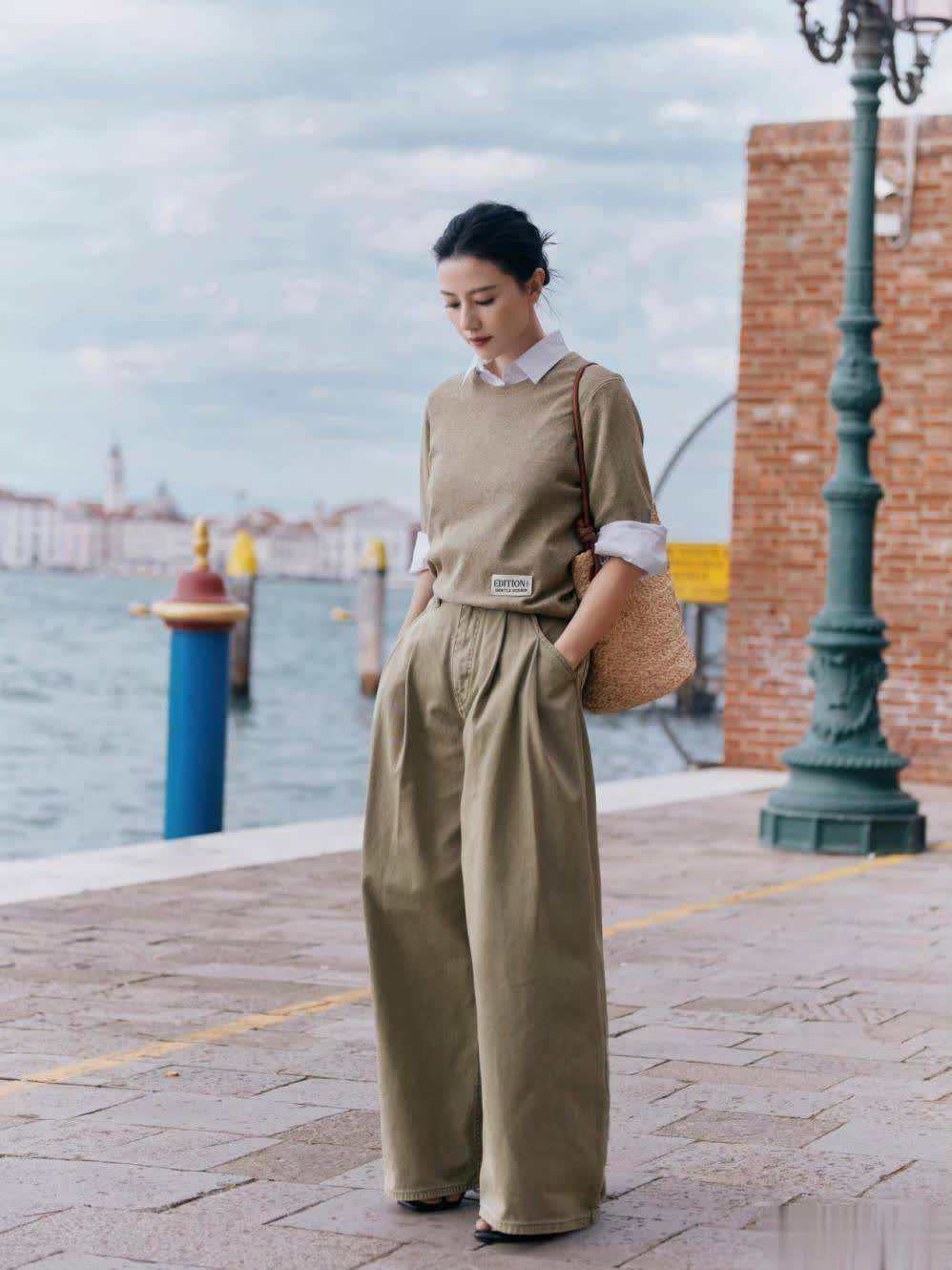 叠穿时手臂可能会有酷热感,为了体现干练、澄澈,衬衫与长T的衣袖可合适挽起。腿上是一条阔腿裤,只见高圆圆双手插兜,随心又潇洒的气质分分钟呈现。阔腿裤是前锋圈的“常青树”,一直以来备受娴雅精们的爱重。唯独可能碰到吐槽的点是,裤腿松量太多变成压身高的风险。