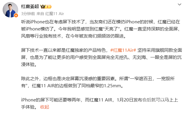 姜超示意,iPhone的屏下时候可能还需恭候两年,而红魔11 Air在1月20日15:00发布会后就能无意上手体验。