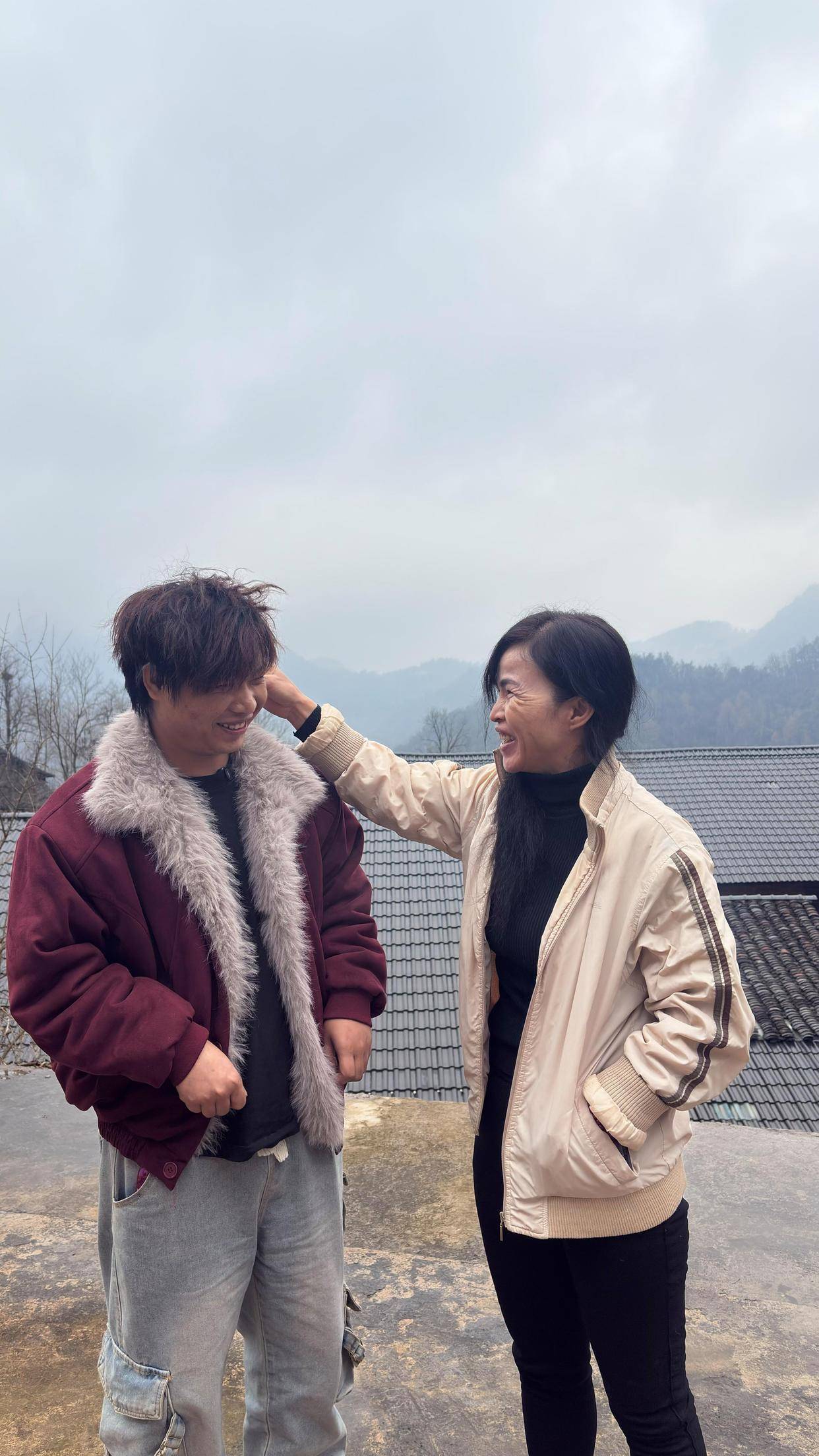 △ 母亲在屋前帮小周整理头发